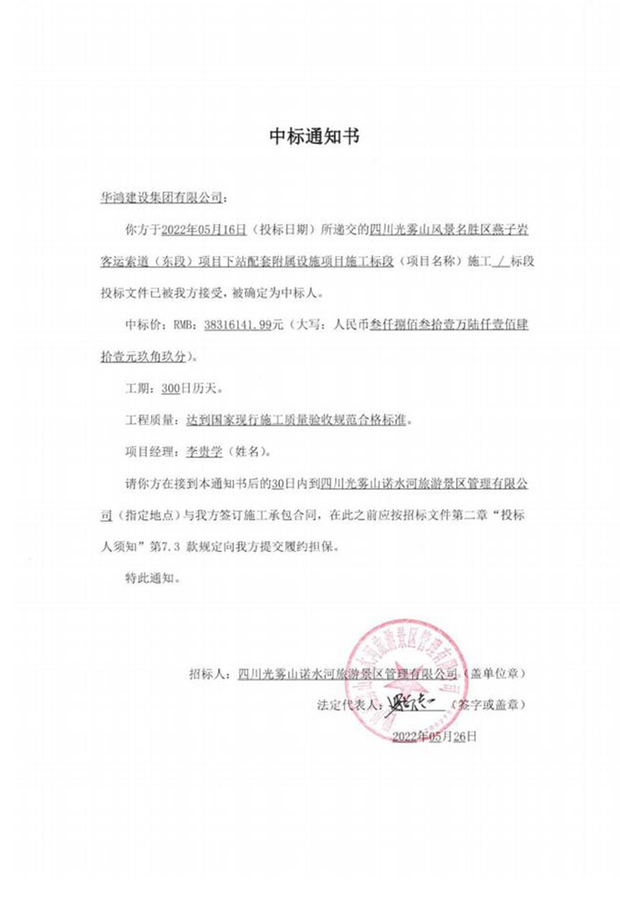 四川光(guāng)霧山(shān)風(fēng)景名勝區(qū)燕子(zǐ)岩客運索道(dà₩∞↑o)(東(dōng)段)項目下(xià)站(zhàn)配套附屬設施項目施工(gōn'≈™g)标段中标結果公示